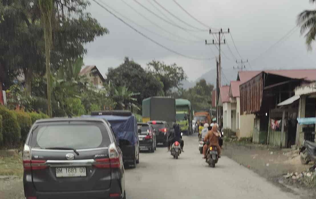 Arus lalu lintas di jalur ini tersendat sejak pagi. Kendaraan dari kedua arah hanya bisa bergerak perlahan, bahkan di beberapa titik nyaris tak bergerak.