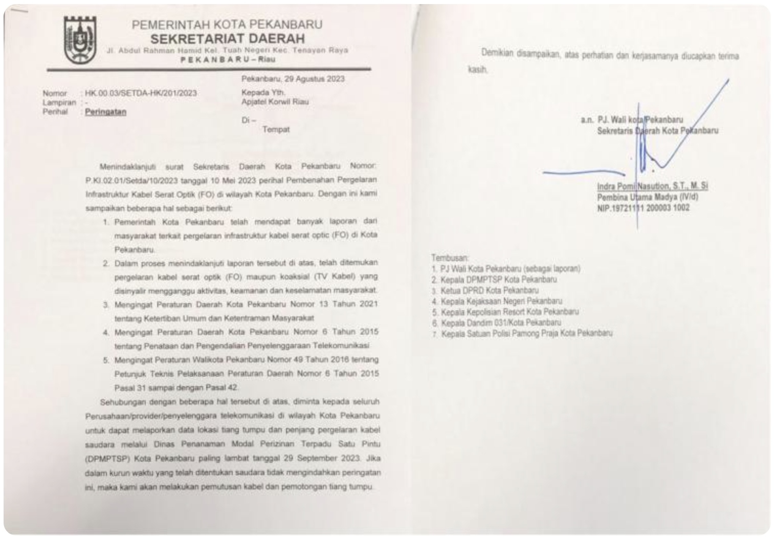 Mediasindonews.com | Pekanbaru - Cuekin surat edaran peringatan terkait keberadaan penyelenggara jaringan telekomunikasi, Pemerintah Kota Pekanbaru, segara akan melakukan tindakan tegas kepada pihak yang bersangkutan dalam waktu dekat ini.