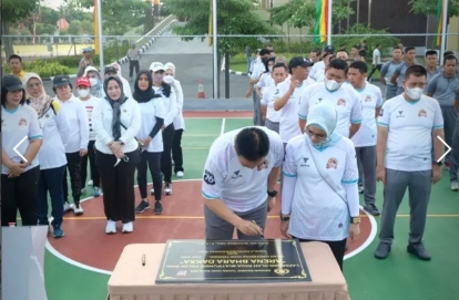 PEKANBARU - Sarana olahraga yang berada di samping gedung utama Mapolda Riau tampak asri, Minggu sore (26/6/2022), diresmikan penggunaannya oleh Kapolda Riau Irjen Moh Iqbal, SIK, M.H.Sarana olahraga yang diberi nama ‘Arena Bhara Daksa’ tersebut diresmikan setelah selesai direnovasi menjadi sarana multi lapangan. Arena Bhara Daksa bisa dipergunakan sebagai lapangan olah raga futsal, basket maupun untuk tennis lapangan.Peresmian ditandai dengan penekanan tombol pembukaan selubung