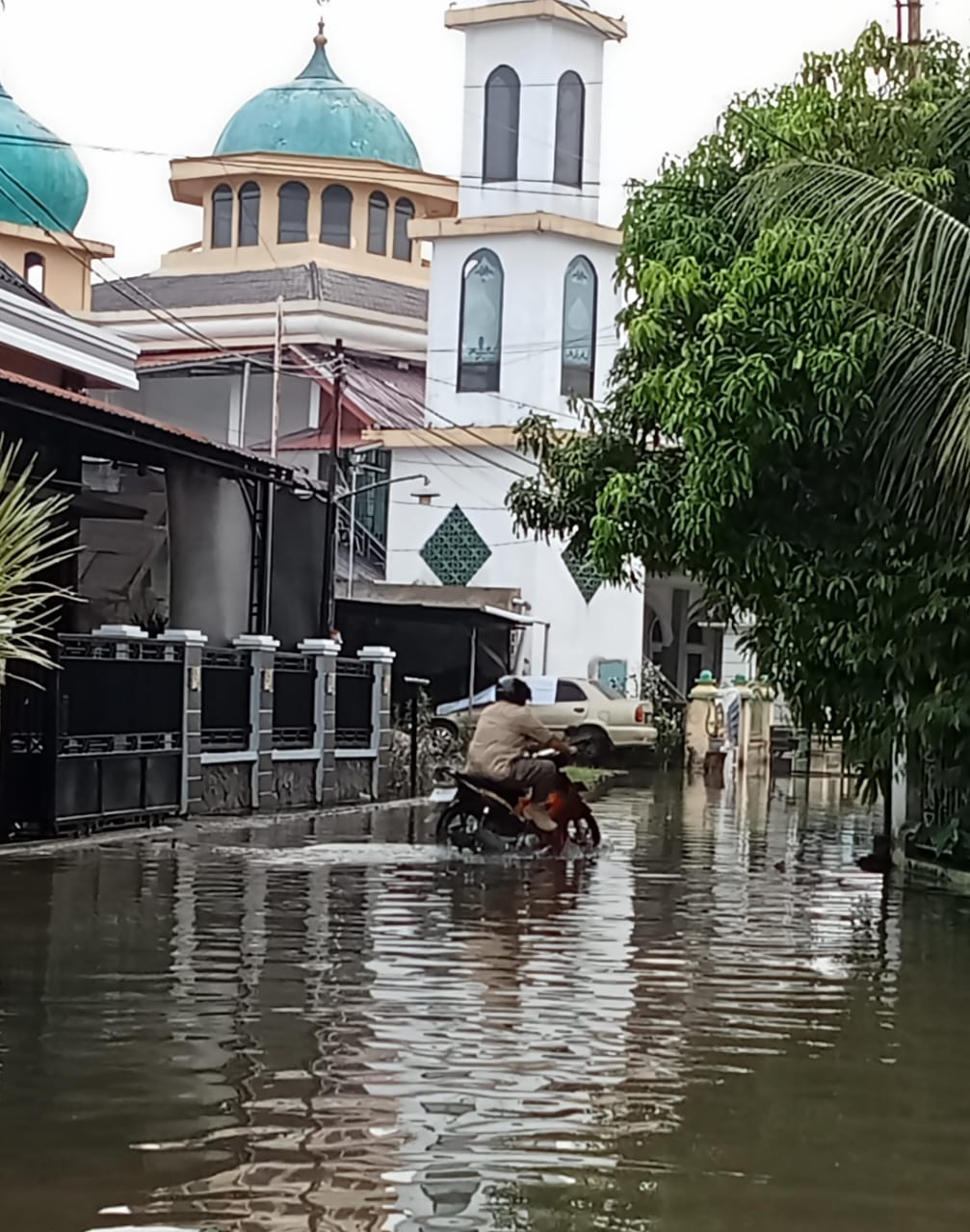 Mediasindonews.com I Pekanbaru — Hujan deras yang mengguyur Kota Pekanbaru, Riau, Minggu (12/10/2025) sore, menyebabkan sejumlah wilayah tergenang air dan lalu lintas tersendat parah. Guyuran hujan mulai turun sekitar pukul 16.38 WIB dan berlangsung cukup lama. Akibatnya, beberapa titik seperti di Kecamatan Sukajadi, Marpoyan Damai, dan Bukit Raya mengalami banjir hingga setinggi 40 senti meter. Seorang warga Bujang mengatakan, air mulai masuk ke dalam rumahnya tak lama setelah hujan