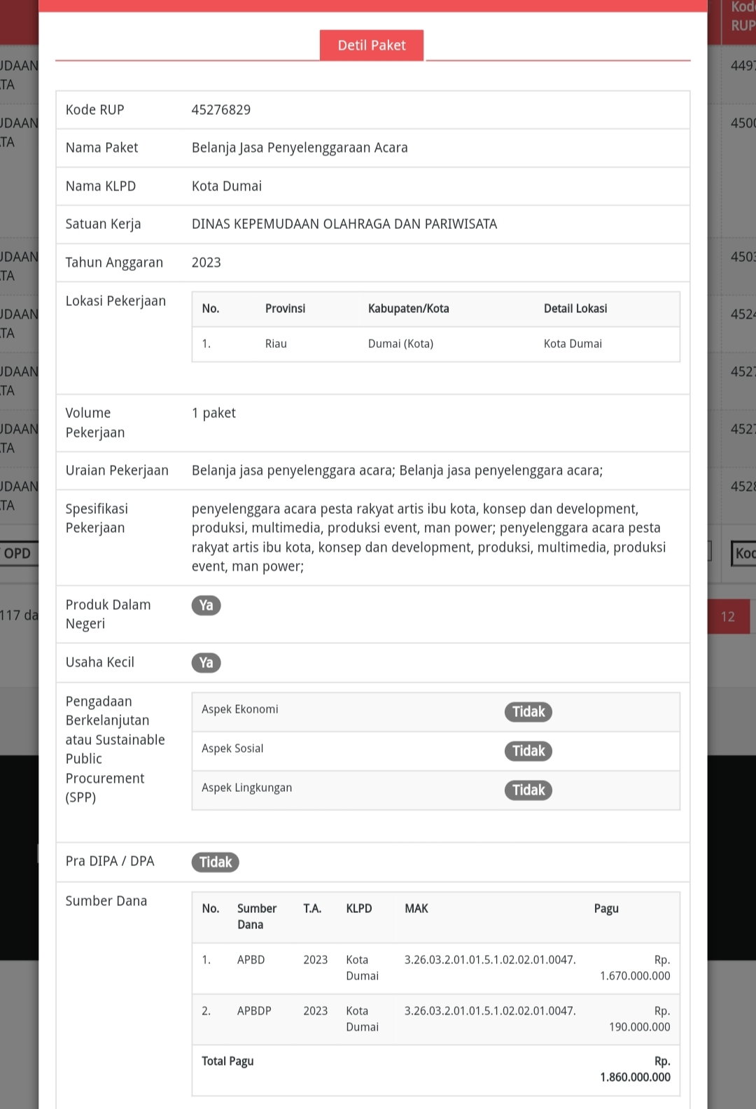 Mediasindonews.com | Dumai – Pemerintah Kota Dumai gelontorkan anggaran sebesar 1,8 Miliar lebih untuk sebuah paket belanja jasa penyelenggara acara. Hal ini diketahui dari sebuah paket di satuan kerja Dinas Kepemudaan Olahraga dan Pariwisata (Diskopar). Dalam detil paket belanja jasa penyelengaraan acara dengan metode pemilihan tender itu mencapai Rp. 1.860.000.000 (Satu Miliar Delapan Ratus Enam Puluh Juta Rupiah) dengan sumber dana APBD dan APBDP Kota Dumai tahun 2023. Adapun dana