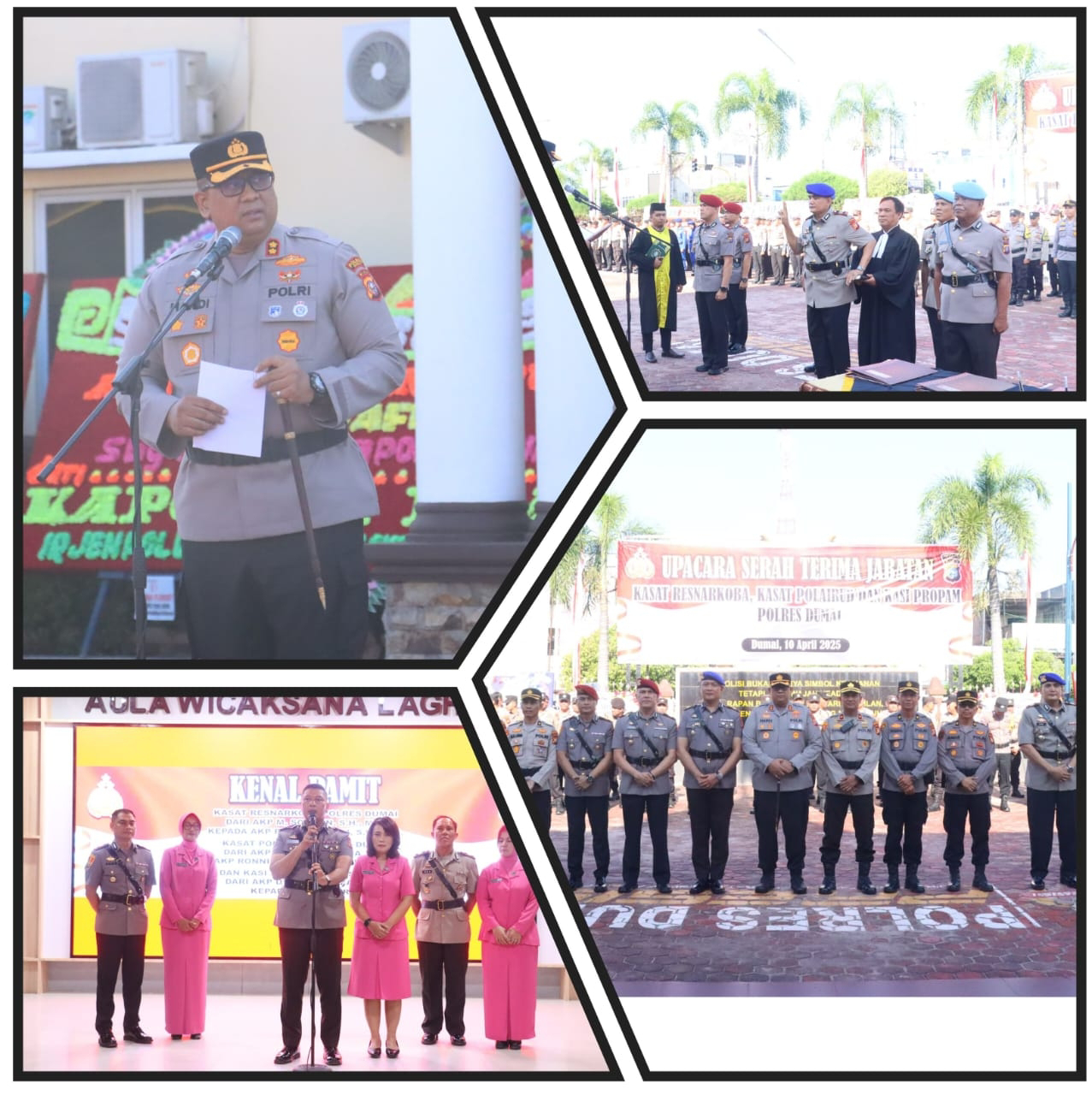 Mediasindonews.com I Dumai - Polres Dumai menggelar upacara serah terima jabatan (sertijab) untuk tiga posisi strategis, yakni Kasat Narkoba, Kasat Polair, dan Kasi Propam. Kegiatan ini dilaksanakan di Lapangan Apel Polres Dumai, Jalan Sudirman, Kelurahan Buluh Kasap, Kecamatan Dumai Timur.