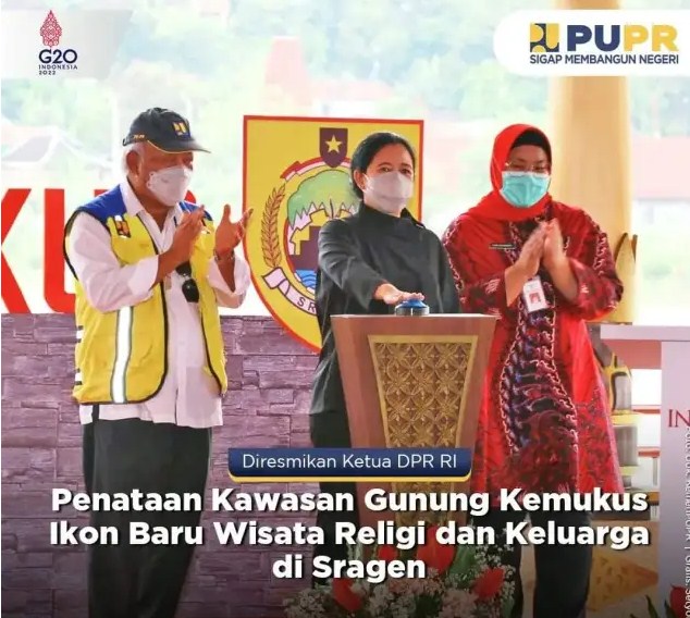 SRAGEN ( Media Sindo News ) - Menteri PUPR Basuki Hadimuljono mendampingi Ketua DPR RI Puan Maharani dan Bupati Sragen Kusdinar Untung Yuni Sukowati meresmikan penataan kawasan wisata Gunung Kemukus di Kabupaten Sragen, Jawa Tengah, Rabu (27/4). Penataan kawasan Gunung Kemukus yang terletak 29 km dari Kota Solo dan 34 km dari pusat Kab Sragen, dilakukan untuk mengembalikan fungsinya sebagai tujuan wisata religi dan wisata keluarga.