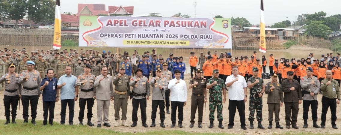 Mediasindonews.com I Kuantan Singingi - Pemerintah Kabupaten Kuantan Singingi (Kuansing) menegaskan komitmen kuatnya dalam memulihkan lingkungan dan menanggulangi dampak kerusakan akibat Penambangan Emas Tanpa Izin (PETI). Dalam Apel Gelar Pasukan Operasi PETI 2025 yang digelar di Desa Seberang Taluk, Kamis (31/7/2025), Bupati Kuansing, Suhardiman Amby, menyatakan siap memperkuat sinergi dengan Pemprov Riau, Polda Riau, dan unsur Forkopimda lainnya untuk menghentikan aktivitas tambang ilegal