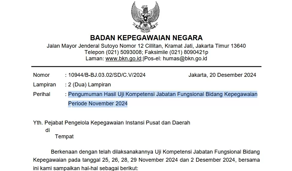 Pengumuman Uji Kompetensi Jabatan Fungsional Kepegawaian Periode November 2024 Beserta Link Unduh Sertifikat Kelulusan