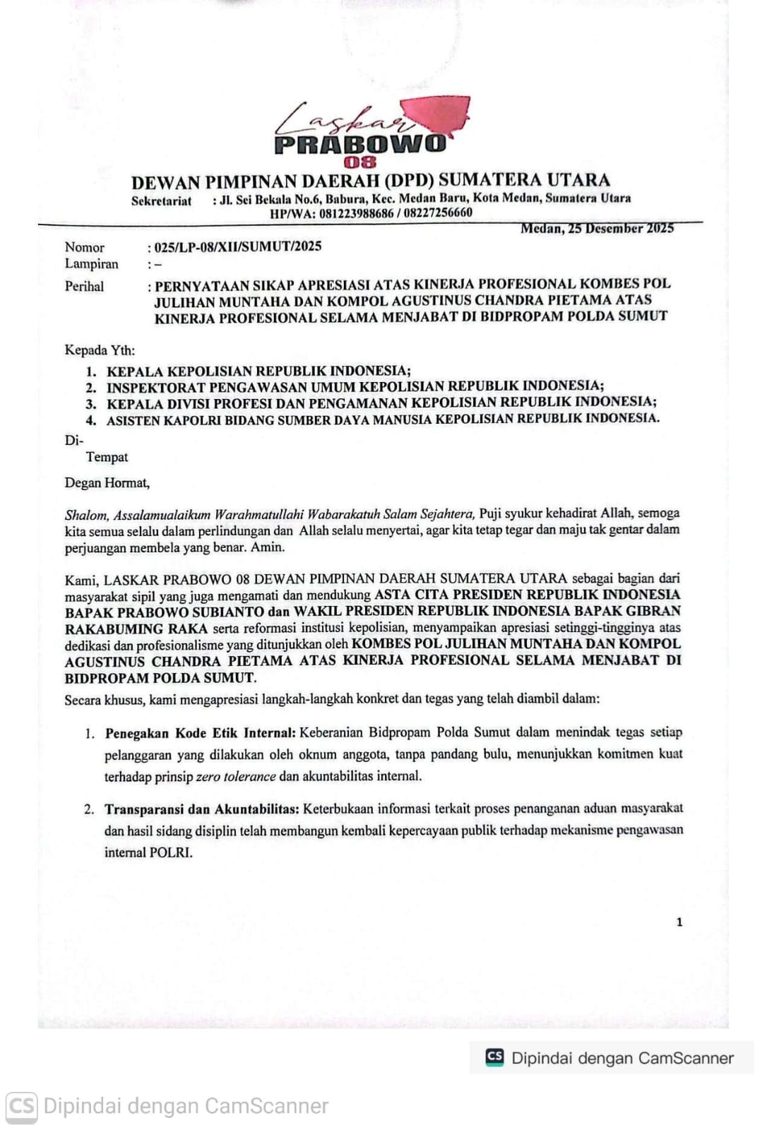 Pernyataan sikap apresiasi atas kinerja profesional Kombes Pol. Julihan Muntaha atas kinerja profesional selama menjabat di Bidpropam Polda Sumut juga kami sampaikan melalui surat nomor: 025/LP-08/XII/SUMUT/2025 yang ditujukan kepada Kapolri, Irwasum, Kadivpropam Polri, AS SDM Polri dengan tembusan kepada Presiden Prabowo, Wakil Presiden Gibran, Ketua Kompolnas, Hashim Djojohadikusumo selaku Ketua Dewan Pembina Laskar Prabowo 08, dan Devi Taurisa, SH., MH., C.L.D selaku Ketua Umum Laskar Prabowo 08, semoga surat pernyataan sikap apresiasi ini dapat menjadi refrensi Polri sebagai bentuk tingkat kepercayaan masyarakat, karena merupakan salah satu referensi utama bagi Polri dalam mengevaluasi dan meningkatkan kinerjanya secara berkelanjutan, tutup Paul.